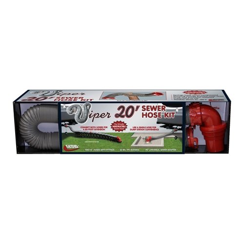 Sewer Hose; Viper ™; 20 Foot Extended Length; 52 Inch Compressed Length For Each 10 Foot Section; 3 Inch Diameter; 25 Mil TPE Material; Gray With Red Fittings; With Two 10 Foot Hoses/ Rotating Fittings/ Four Drip Caps/ 90 Degree Sewer Adapter; Boxed